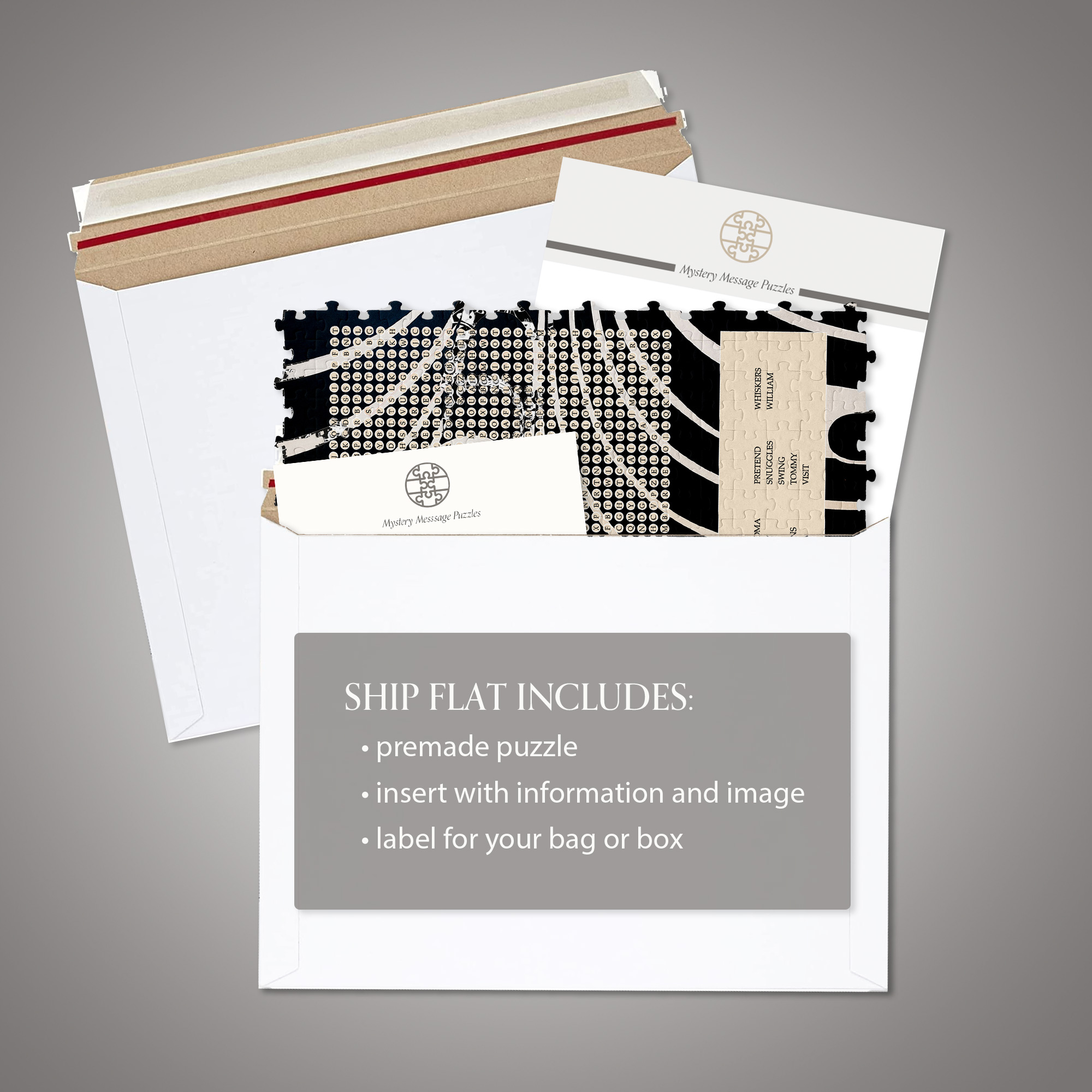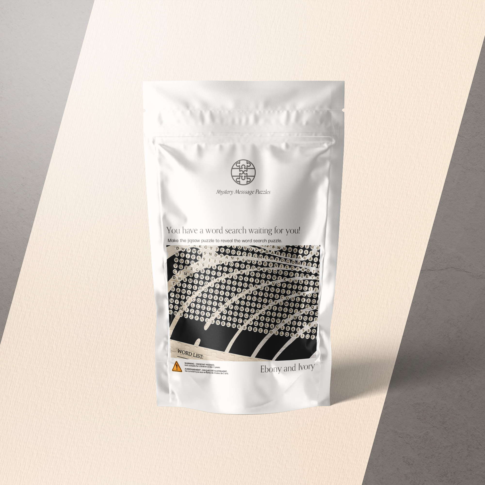 Ebony and Ivory word search puzzle is a geometric puzzle with a modern vibe. The first step is to make the jigsaw puzzle which reveals the word search puzzle. You can choose the words that are hidden in the word search to personalize it (like adding grandkids names, activities, etc for grandma) or to provide clues of a different gift (use words like plane, ship etc for a cruise). See below for some ideas.